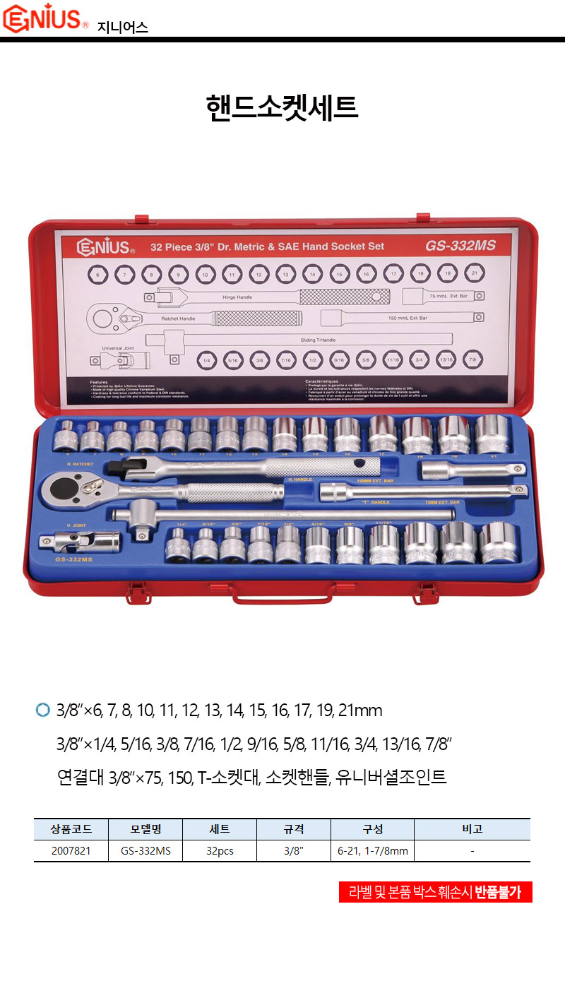 [지니어스] 3/8SQ 핸드소켓렌치세트GS-332MS