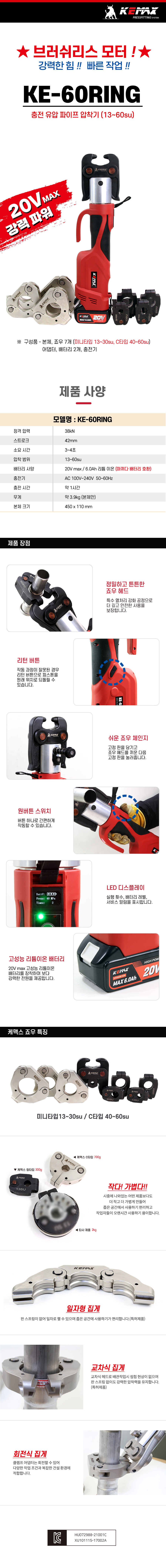 [케맥스] 20V 충전 유압 브러쉬리스 배관압착기 링타입KE-60RING